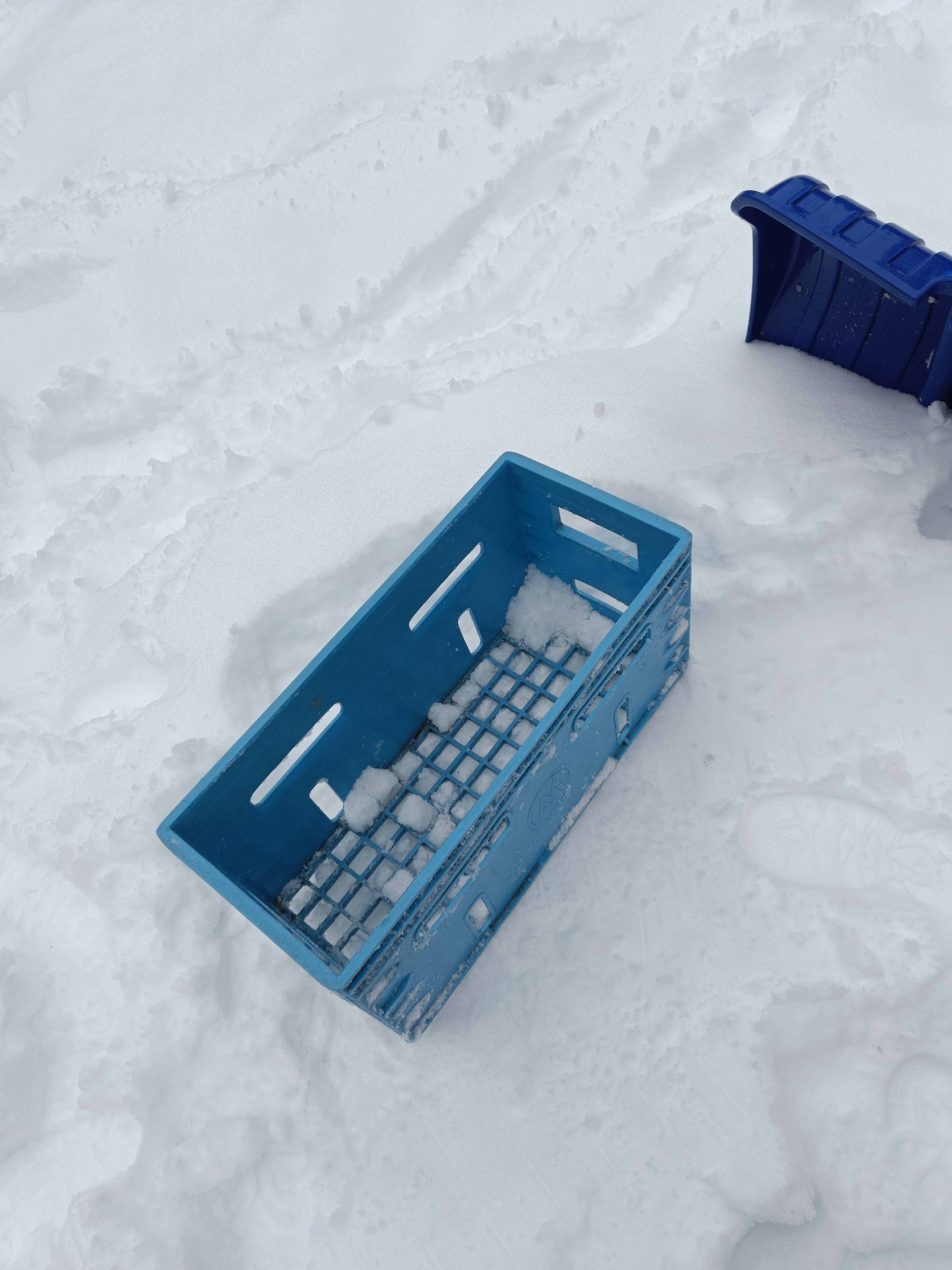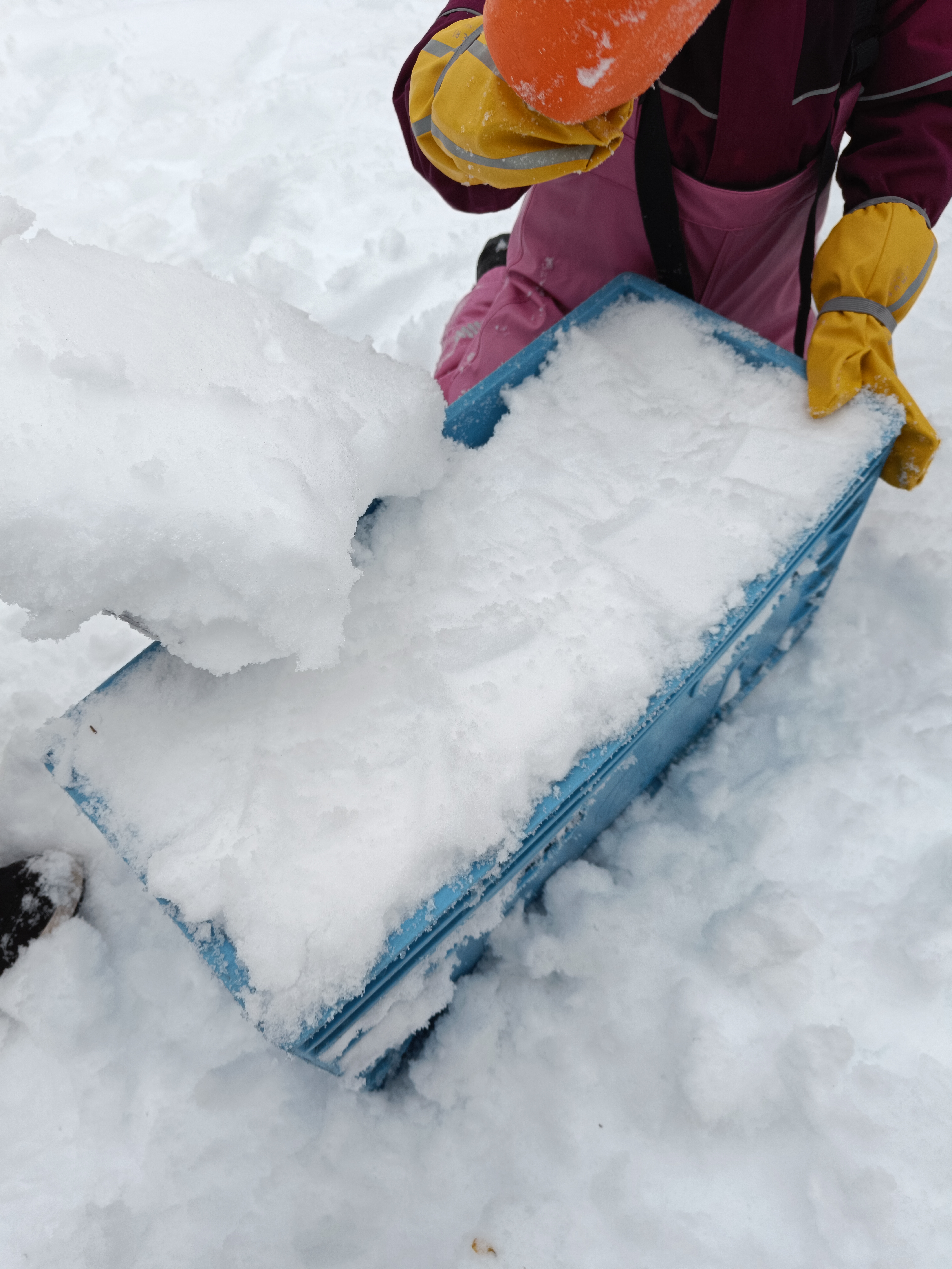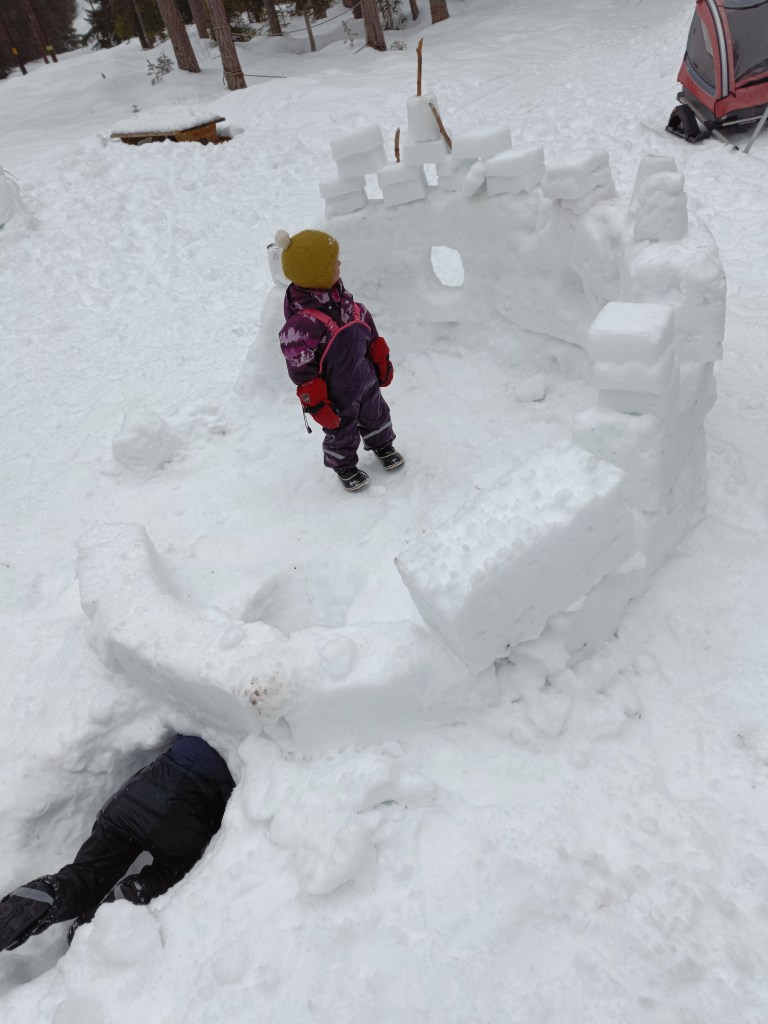 Om snøen er kram eller våt er det supert å lage snøborg med kasser! Da pakker man snø i kassen og klapper/tramper snøen hardt sammen, og vips så har man blokker å bygge med! Vi liker å lage borgen med flere vindu, tunell inngang og med flagg