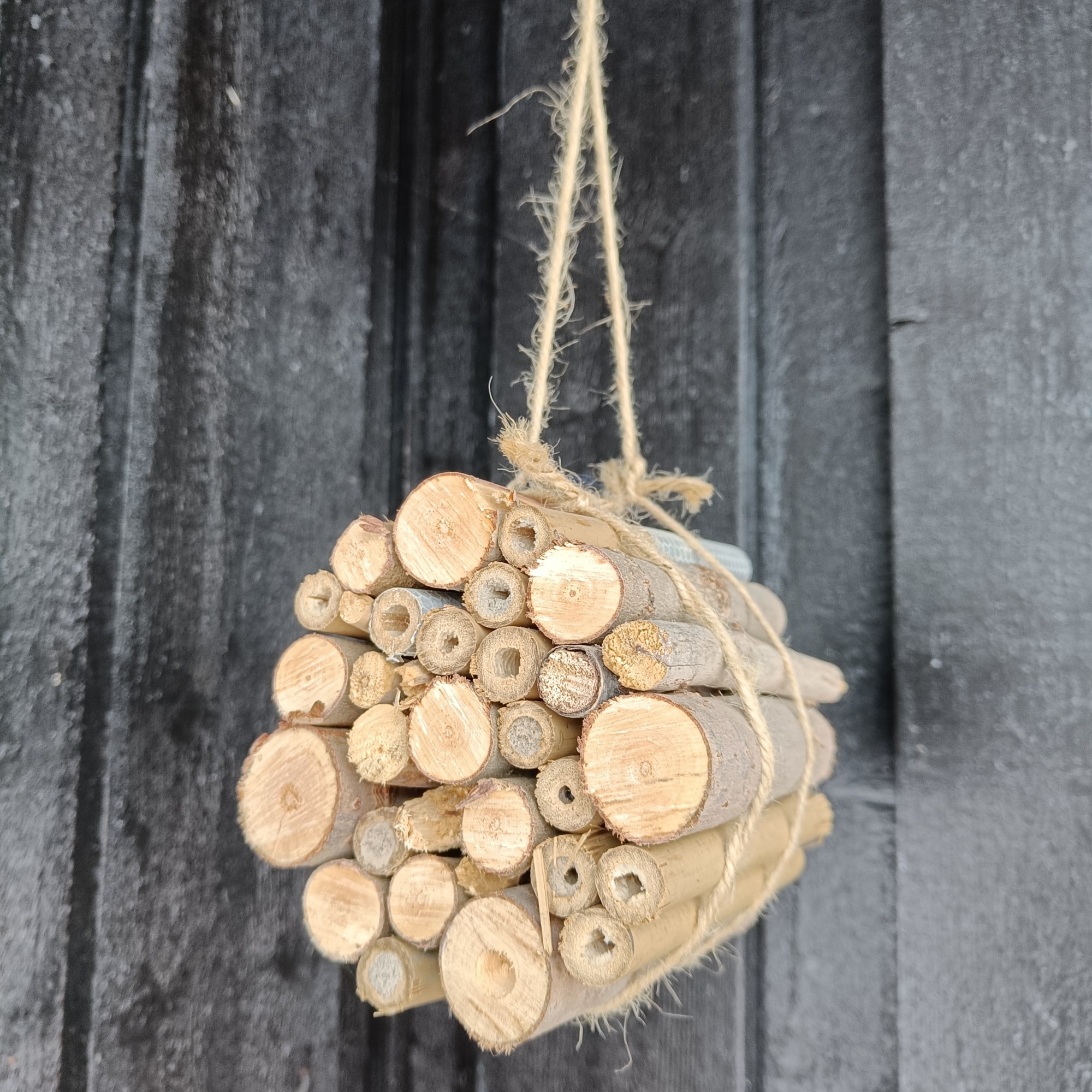 Heng opp insekthotellet på en solrik vegg utendørs, cirka 1–1,5 m over bakken, og gjerne godt beskyttet mot regn og vind. Plasser det i nærheten av planter som bier og andre pollinerende insekter liker.