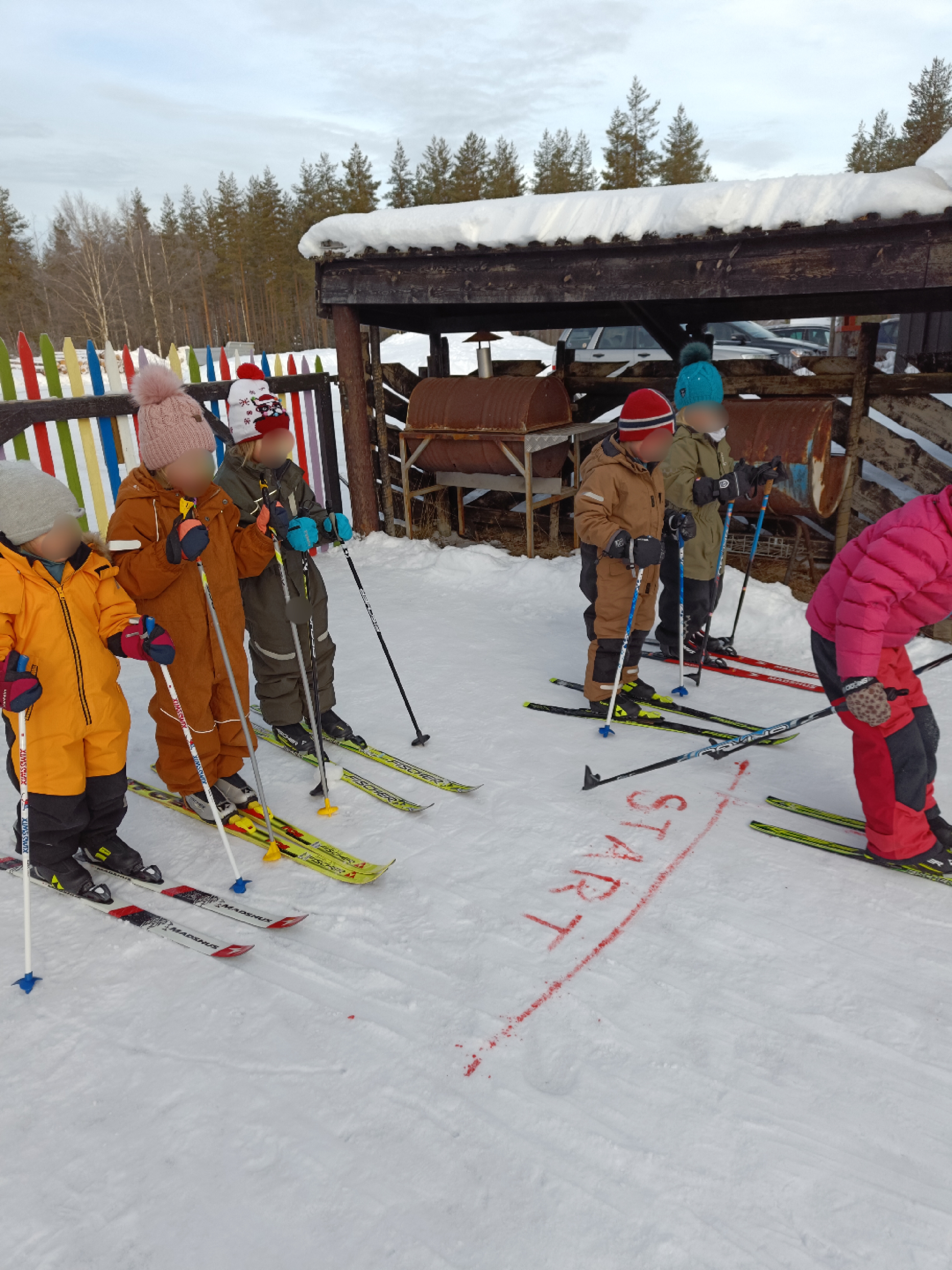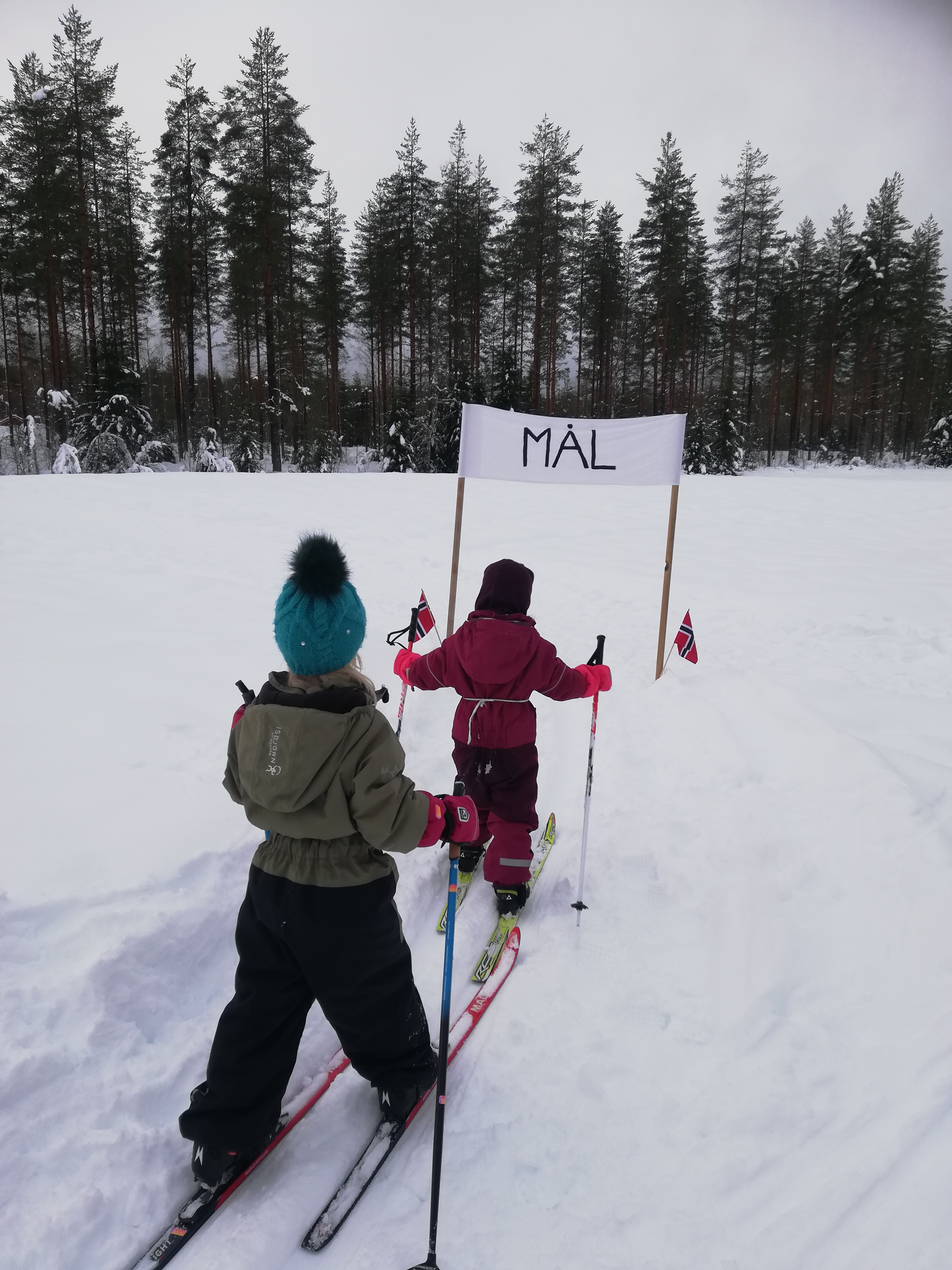 For å gjøre skituren morsom vi å lage til et skirenn. Her kan man på enkel måte skrive start/mål med maling i snøen, eller man kan lage faner om man har materialer til det.