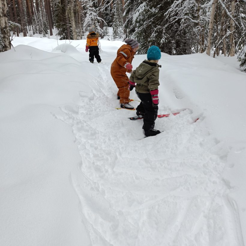 Typisk for påsken er at vi går på ski! Vi i barnehagen går ofte på ski, enten innafor barnehagens uteområde, opp til lavvoen eller turer i skogen.